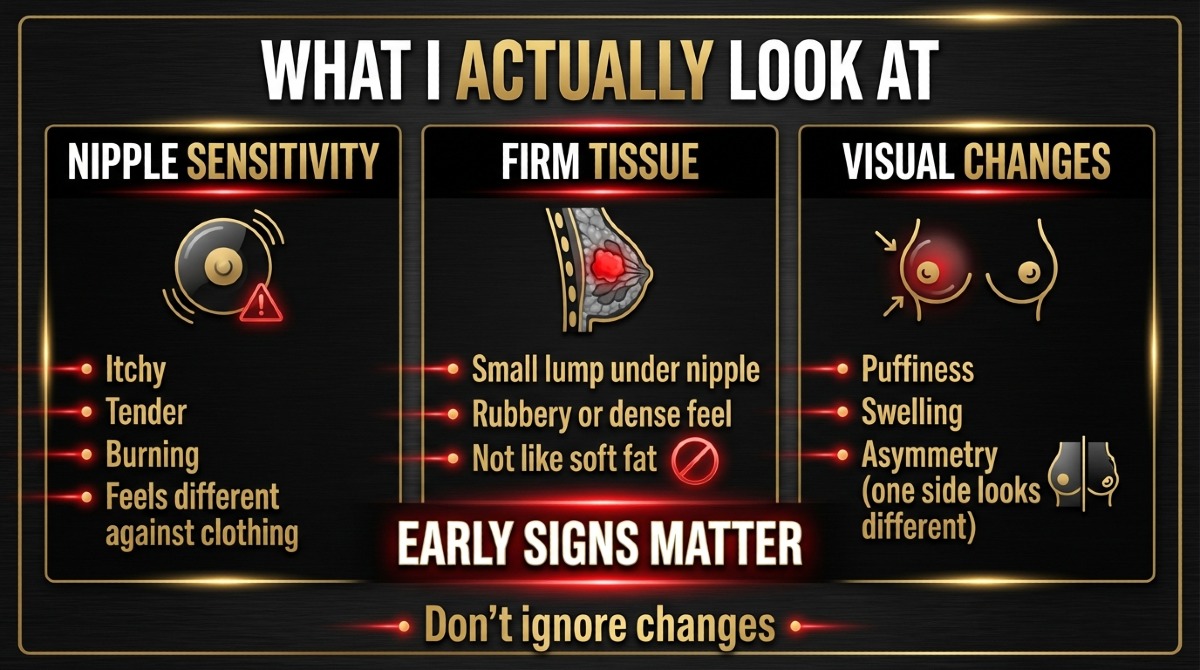 This is where I stop bullshitting myself. Chest fat feels soft and spread out. Early gland tissue usually feels different, more like a small rubbery disc or knot under or behind the nipple. It may be one side first. It may hurt when I press it. That doesn’t mean I should play surgeon with my fingers all day, but it does mean I don’t ignore it.