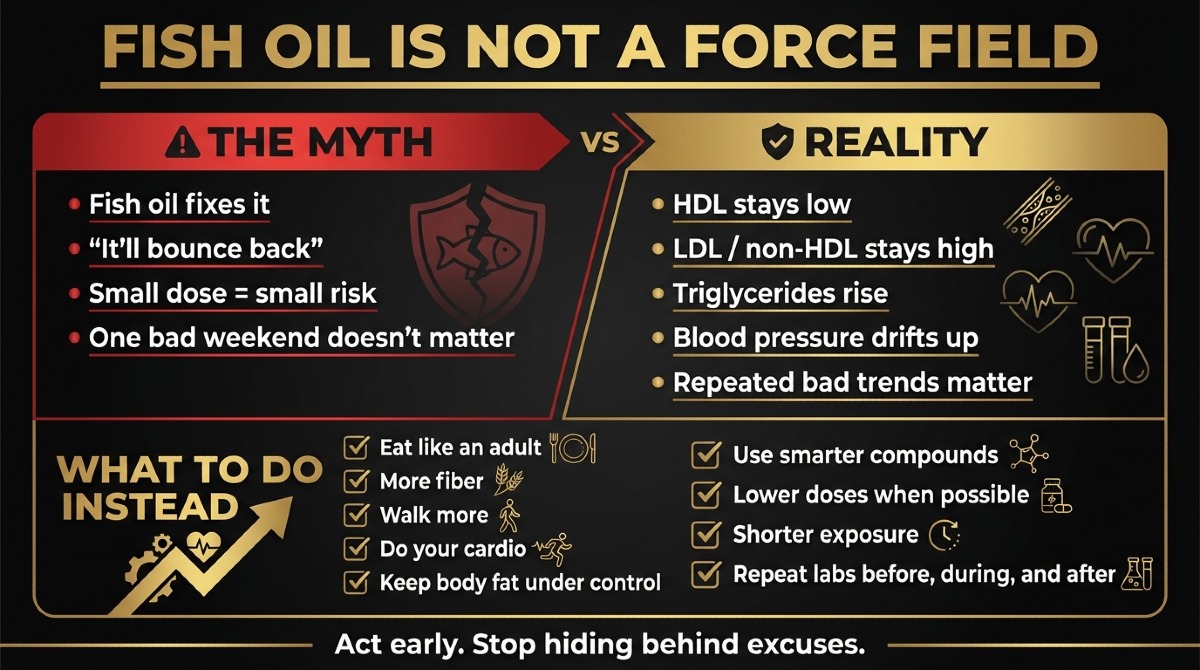 Stop acting like fish oil is a force field. Omega 3s can help, sure, but they don’t erase a reckless cycle, zero cardio, fast food, low fiber, bad sleep, smoking, and 25 pounds of sloppy gain.